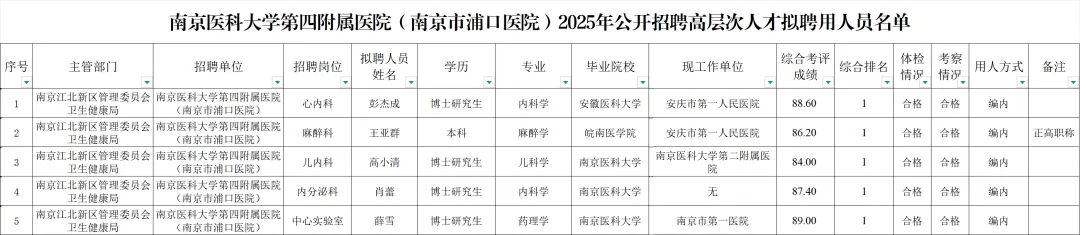 南京医科大学第四附属医院2025年公开招聘高层次人才拟聘用人员名单公示
