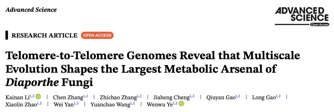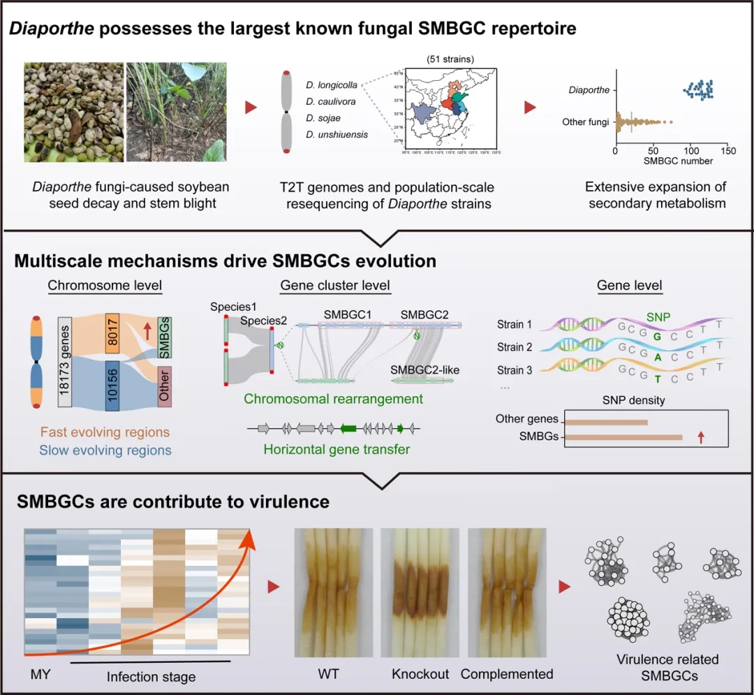 2026年3月13日,南京农业大学王源超教授团队在国际权威期刊《Advanced Science》发表了题为“Telomere-to-telomere genomes reveal that multiscale evolution shapes the largest metabolic arsenal of Diaporthe fungi”的研究论文。该研究成功获得引起大豆拟茎点种腐(茎枯)病的四种拟茎点霉Phomopsis(间座壳Diaporthe)属病原菌的染色体水平基因组组装,发现该属拥有真菌中数量最多、种类最丰富的次级代谢生物合成基因簇(SMBGC),并从染色体结构、基因簇组成到基因序列的多尺度进化层面,揭示了SMBGC快速扩张的机制,为理解植物病原菌的毒力变异与生态适应提供了新见解。