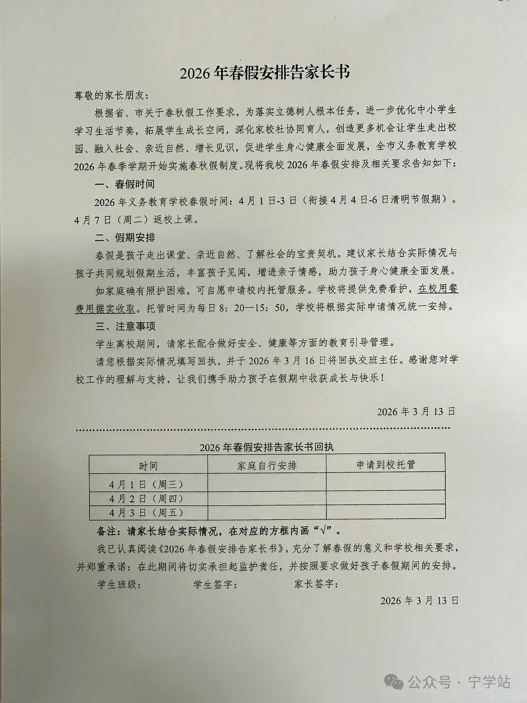 近日,有家长在社交媒体分享了学校下发的《2026 年春假安排告家长书》