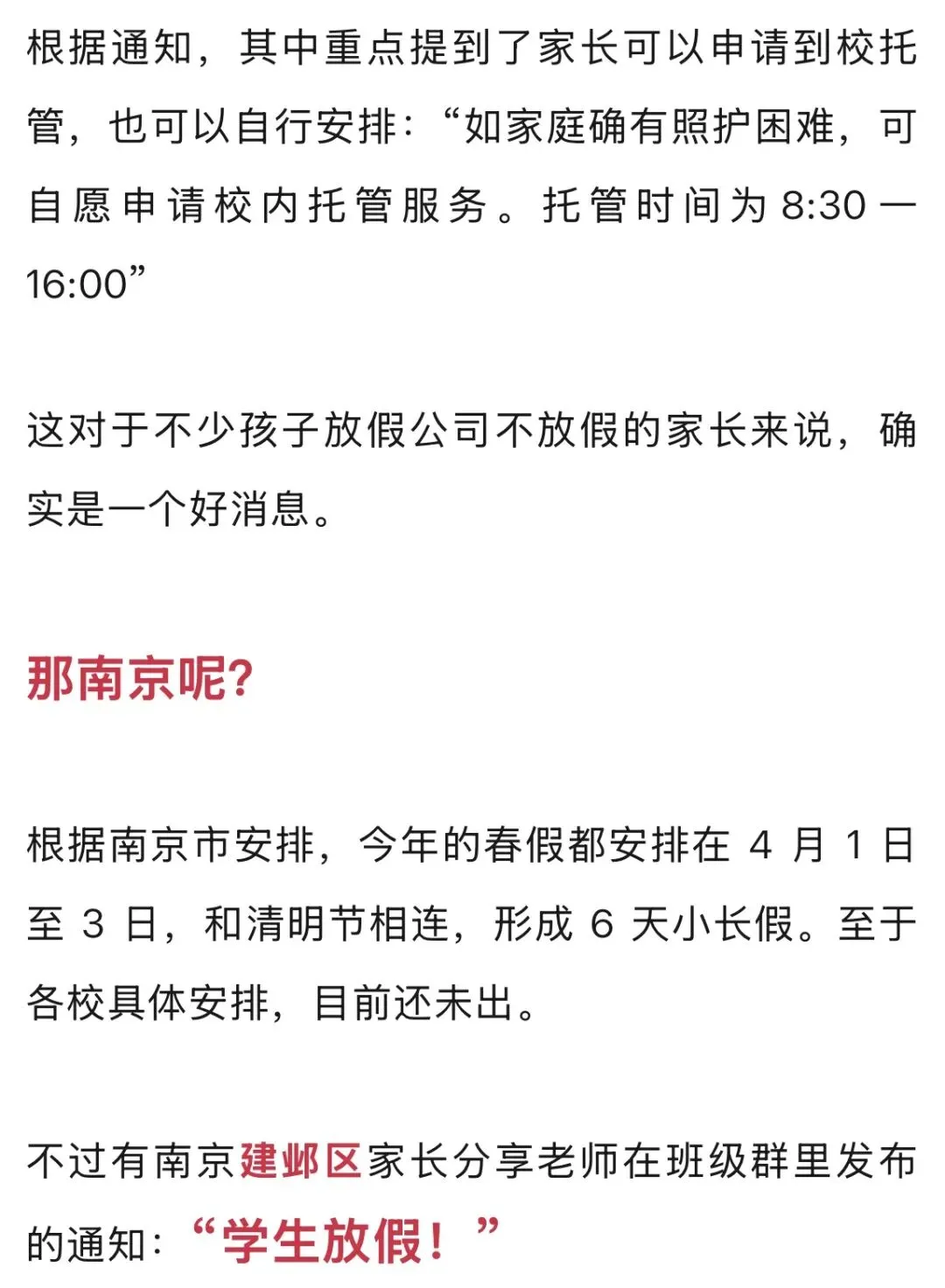 某江宁学校家长分享“需要做好托管安排!”也就是说学生确实放假,没有条件的家庭也可申请托管。