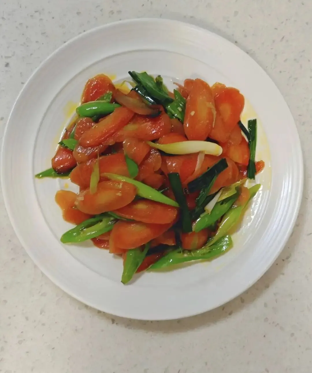 蒜苗炒胡萝卜、大白菜鸡蛋汤