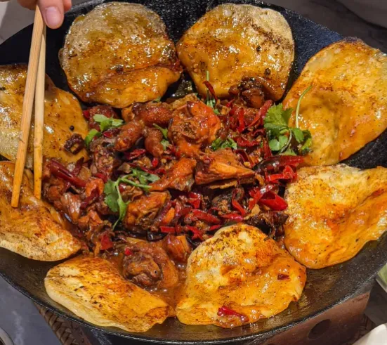 地锅鸡做法不复杂:鸡块先煸出油,再下姜蒜和酱料炒香,添水小火慢炖。面团揪成小饼贴在锅沿,借蒸汽和汤汁一起熟。起锅前收一收汁,鸡肉入味,饼子一撕,蘸汤正好。