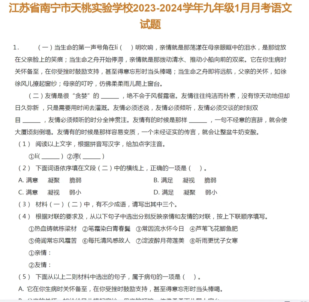 2017-2024年南京市各区初三下学期月考语文试卷及答案解析