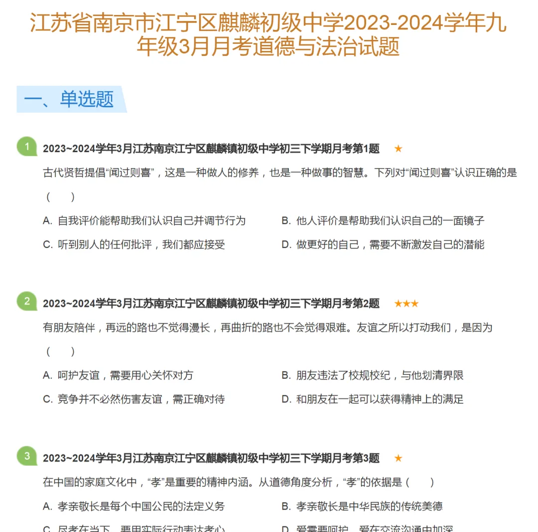 2023-2024年南京市各区初三下学期月考政治试卷及答案解析