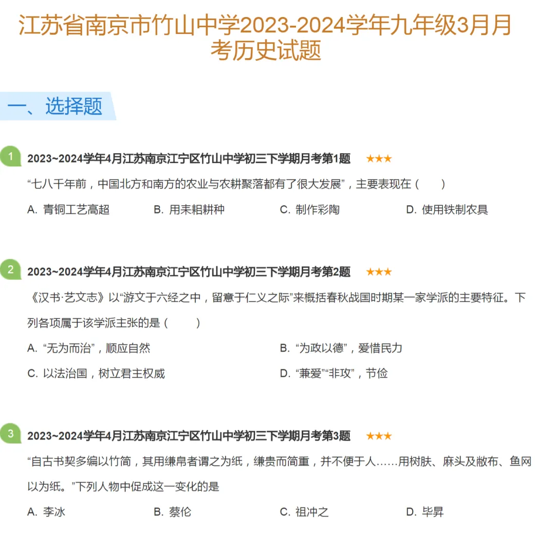 >2023-2024年南京市各区初三下学期月考历史试卷及答案解析