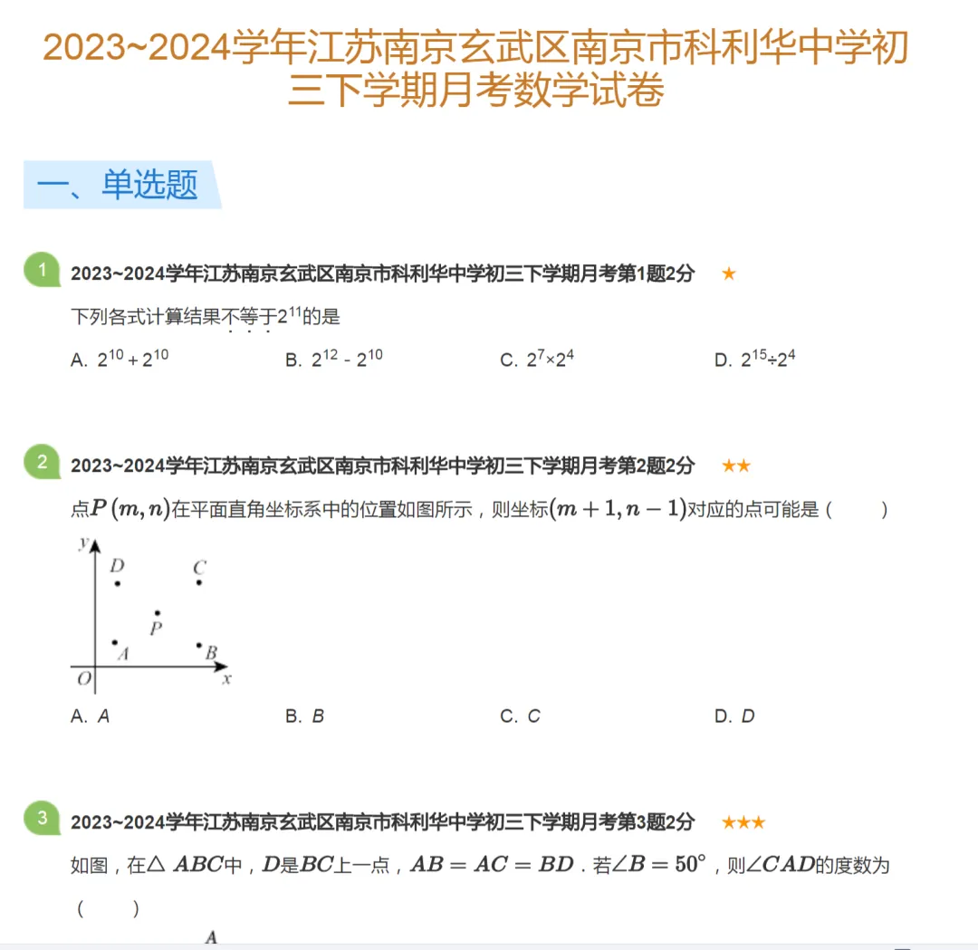2018-2024年南京市各区初三下学期月考数学试卷及答案解析