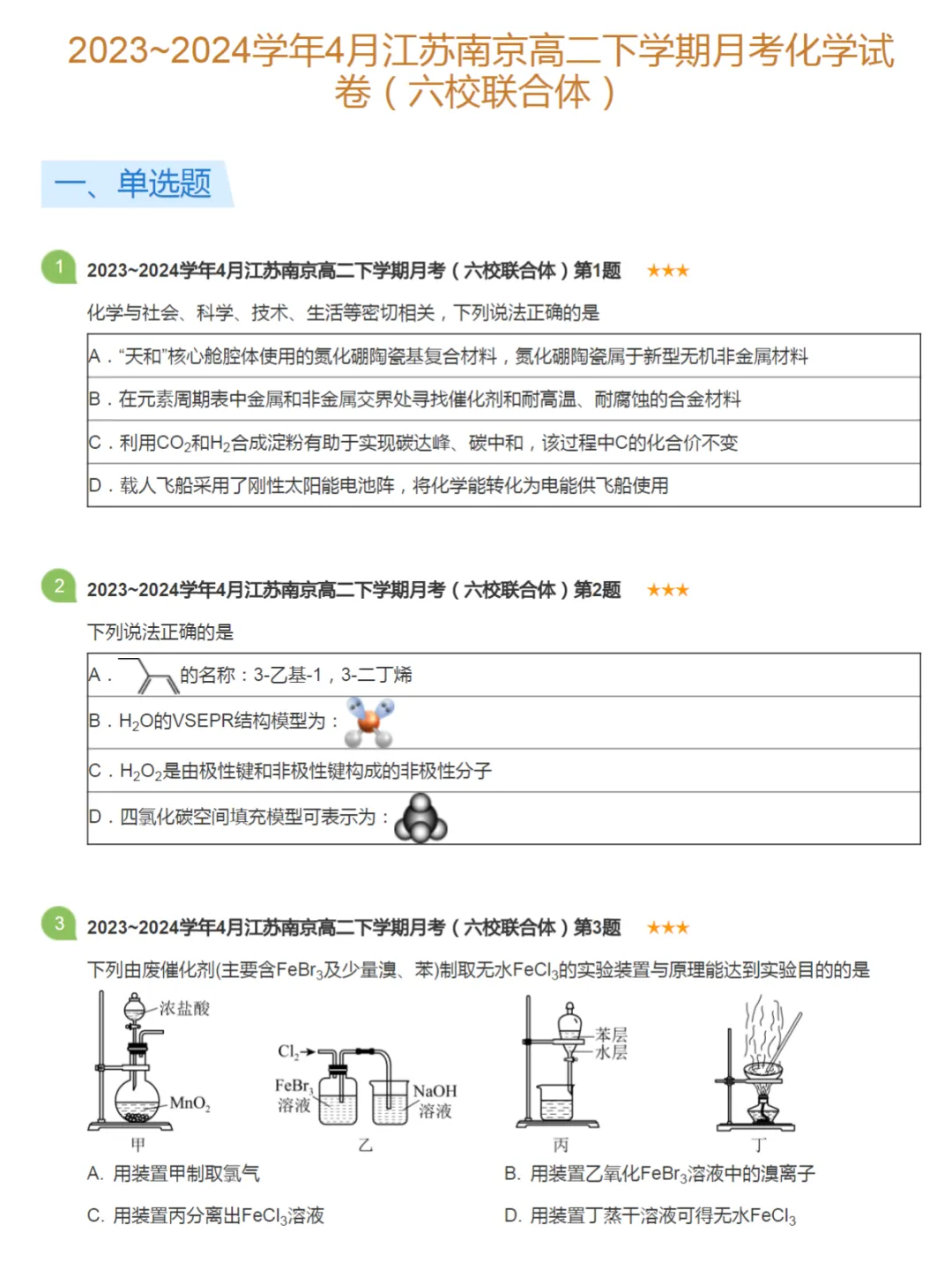 2019-2024学年江苏南京高二下学期月考化学真题及答案解析