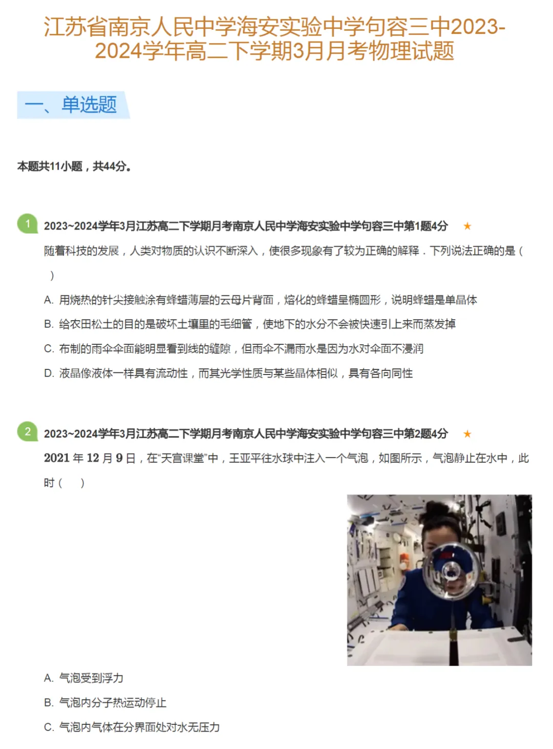 2019-2024学年江苏南京高二下学期月考物理真题及答案解析