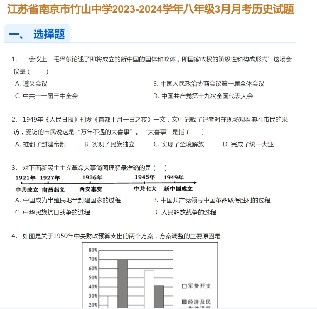 >2020-2024年南京市各区初二下学期月考历史试卷及答案解析