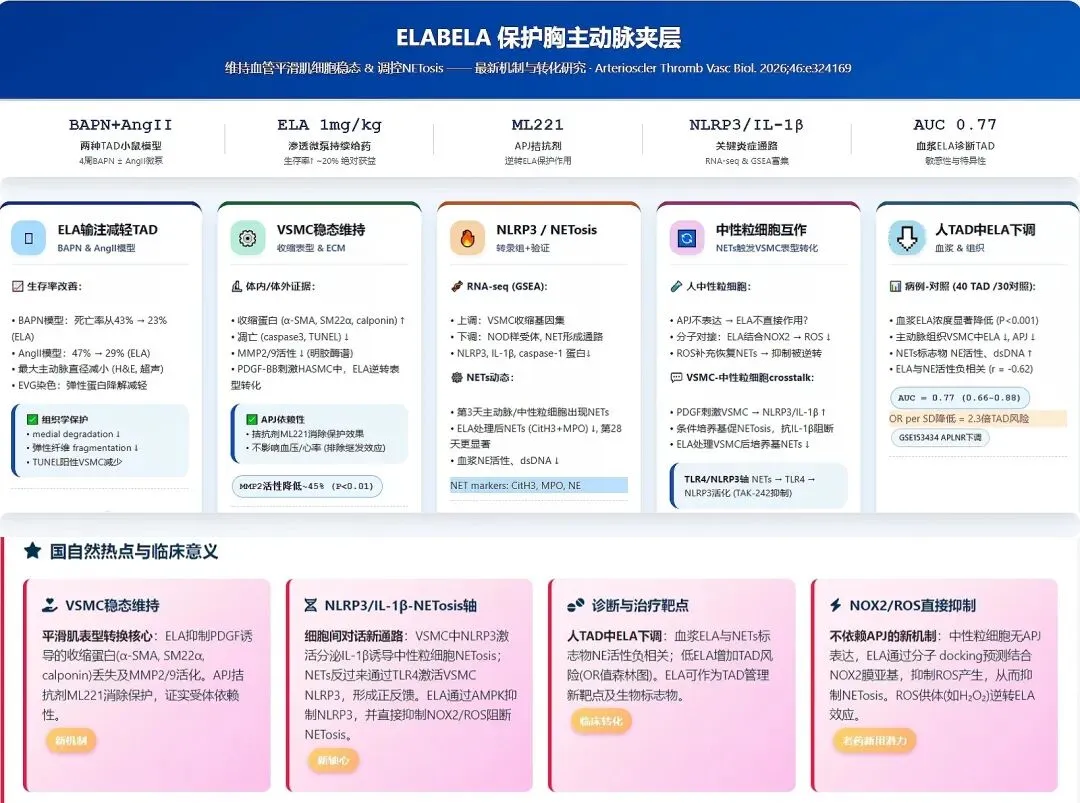 研究发现,NETs可激活VSMC上的TLR4,触发NLRP3炎症小体活化【图6L, 6M】,导致VSMC自身发生表型转换【图6I-6K】,形成正反馈恶性循环。而ELA能同时作用于循环两端,有效遏制TAD发展。