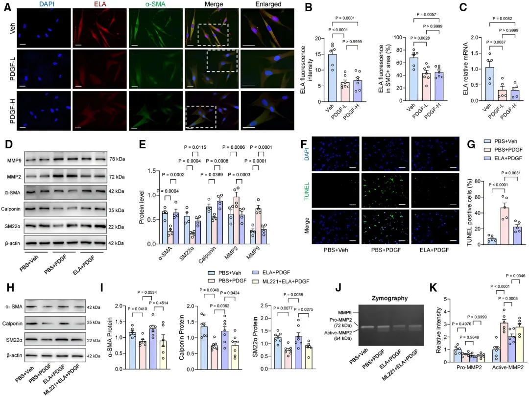 为验证ELA的直接作用,研究者用血小板衍生生长因子(PDGF)处理人主动脉VSMC。PDGF刺激后,细胞内源性ELA表达显著下降【图2A-2C】。
