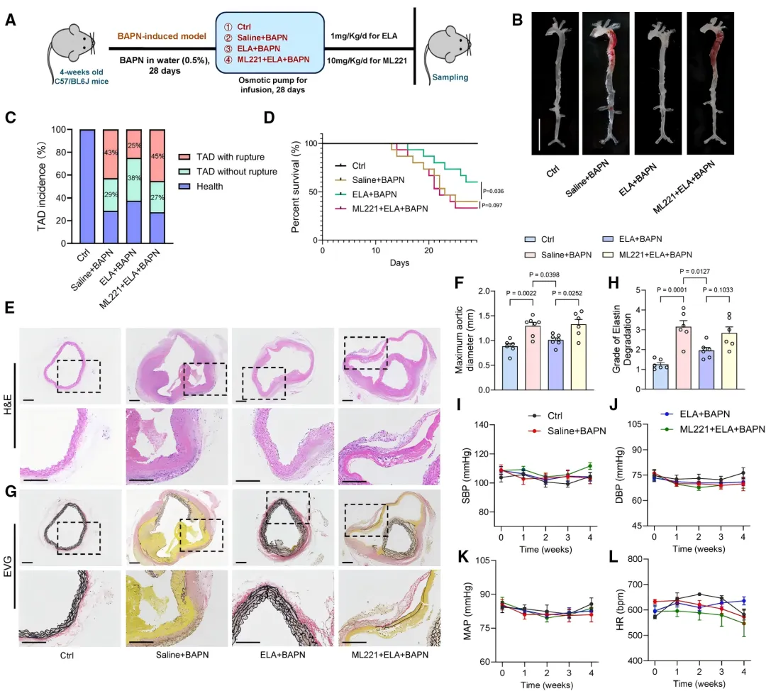 结果显示,ML221几乎完全逆转了ELA带来的生存获益【图3D】和抑制主动脉扩张的效果【图3E, 3F】。各组小鼠血压和心率无显著差异【图3I-3L】,表明ELA直接作用于血管壁,而非通过影响血流动力学。