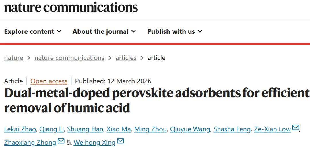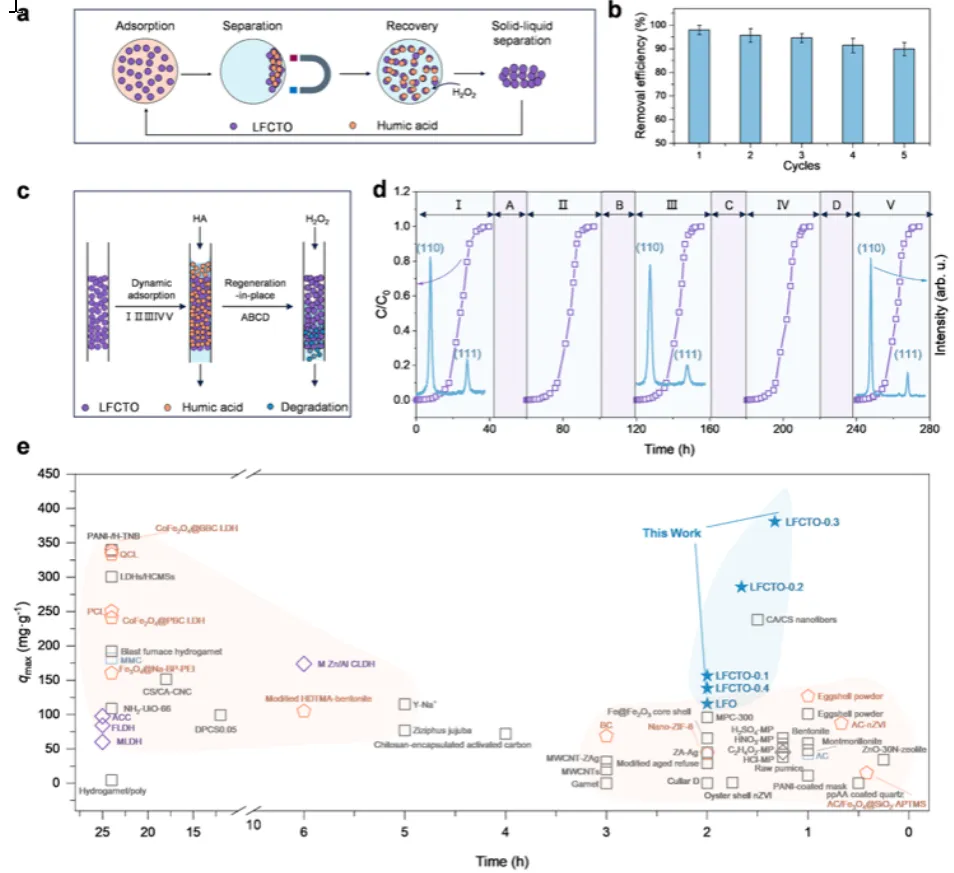 腐殖酸(HA)常用于日常的水处理消毒领域,但在水的氯化消毒过程中会形成三卤甲烷、卤乙酸等致癌消毒副产物,对水生生物和人类健康构成严重威胁。鉴于此,南京工业大学刘泽贤、仲兆祥和邢卫红等人在期刊《Nature communications》上发文“Dual-metal-doped perovskite adsorbents for efficient removal of humic acid”,该研究提出一种 B 位双金属掺杂策略,制备出铁磁性钙钛矿型吸附剂,用于快速高效降解腐殖酸。研究选取钙钛矿氧化物 LaFeO₃作为基础材料,利用其独特的晶体结构、可调控性和固有的铁磁特性,通过在 B 位掺杂钛(Ti)和钴(Co),构建出一种双功能钙钛矿吸附剂。该吸附剂不仅具有 381 mg/g 的高吸附容量,吸附速率快,还可通过原位再生或磁性回收进行芬顿(Fenton)再生。计算模拟从分子层面揭示了钙钛矿吸附剂与腐殖酸之间的相互作用机制。