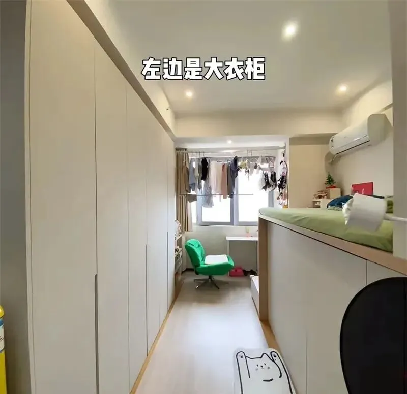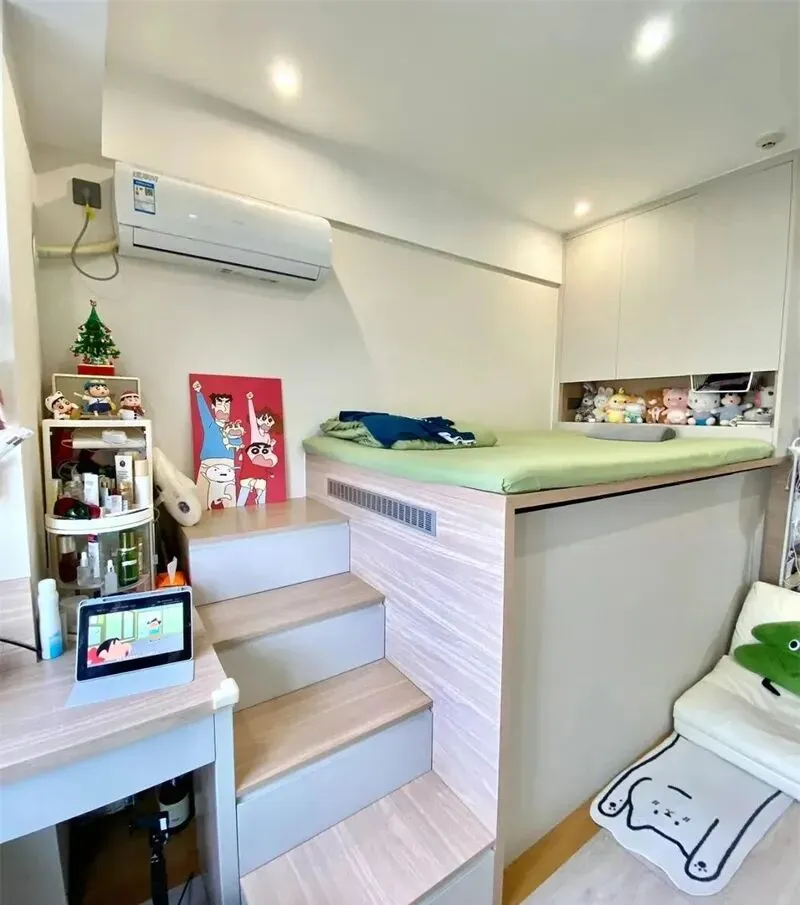 她说自己就住在江宁,房子20平米,站起来转个身都有点费劲,特别是天热的时候,卧室的空间,总有点闷,她没有买成品床,而是自己设计了个地台,其实最早我看到这种地台床,都是在香港、日本那些出租屋里,觉得离自己很远,没想到南京也有这么玩儿的,她直接把地台垫高1米2,最上面是休息区,床下面全是储物空间,这样一来啊,屋里大部分杂物都藏进去了,看着真的整洁多了,连厨房的小锅碗瓢盆都能塞进去,