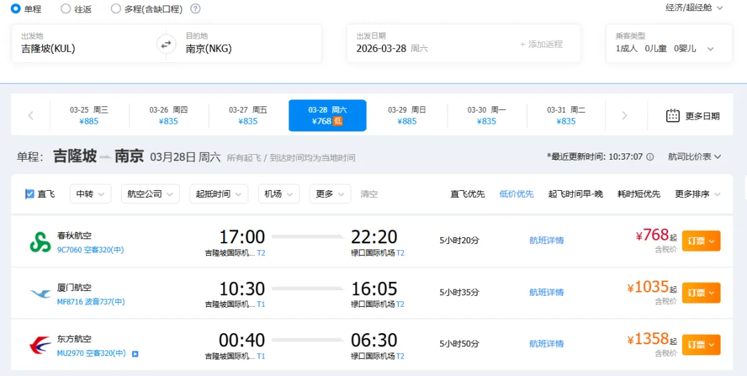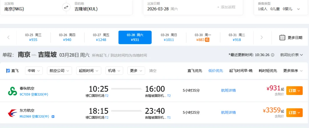 以3月28日的航班为例,春秋的时刻比东航好太多,价格只有不到1/3,你会选哪个? 不要告诉我春秋没免费行李托运、座位硬之类的陈词滥调。