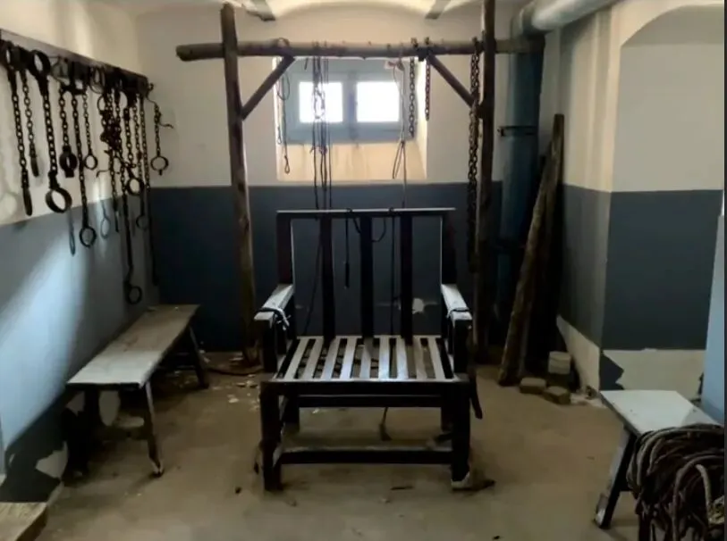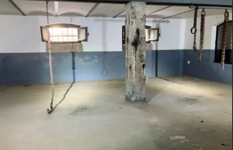 天花板上横着粗重铁梁,上面挂着一圈圈锈迹斑斑的铁环,是当年用来固定、悬吊囚犯的刑具。