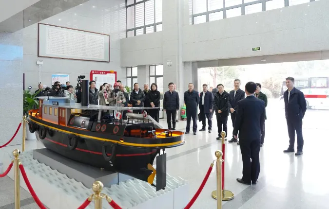 活动探访环节亮点纷呈。嘉宾们循着“原点”足迹,依次参观了燃煤接卸码头、二期建设现场、运行集控室、“京电号”模型和厂史陈列馆。全长360米的顺岸式码头作为能源保供“动脉”,7万吨级泊位与全自动卸煤系统尽显智慧化能源枢纽的硬核实力,生动展现了南京发电厂服务“一带一路”倡议的责任担当。大唐南电二期2×745MW燃气轮机创新发展示范项目作为国家能源局重点项目,承载着重型燃机核心技术自主化的国家级使命,展现了中国大唐胸怀“国之大者”,保障能源安全的先行姿态。运行集控室内,两台66万千瓦超超临界燃煤机组历经DCS自主可控改造,以高度安全性、稳定性、自动化水平和优良环保指标,彰显企业在科技创新和绿色转型中的卓越风采。由全国第一届劳动模范李士海后人亲手打造的1:6“京电号”小火轮模型,静静诉说着1949年那次作为“渡江第一船”载入史册的英勇航程,其承载的“忠党爱国、许党报国”精神,已深深融入企业血脉,成为中国大唐传承红色基因的鲜活载体。厂史陈列馆内,珍贵的历史影像与实物资料,全景呈现了大唐“原点”115年来始终与民族命运和国家发展同频共振的忠党报国史。参观过程中,嘉宾们不时驻足聆听、询问交流、拍照留念,被大唐“原点”深厚的红色历史底蕴和卓越品牌形象深深打动。