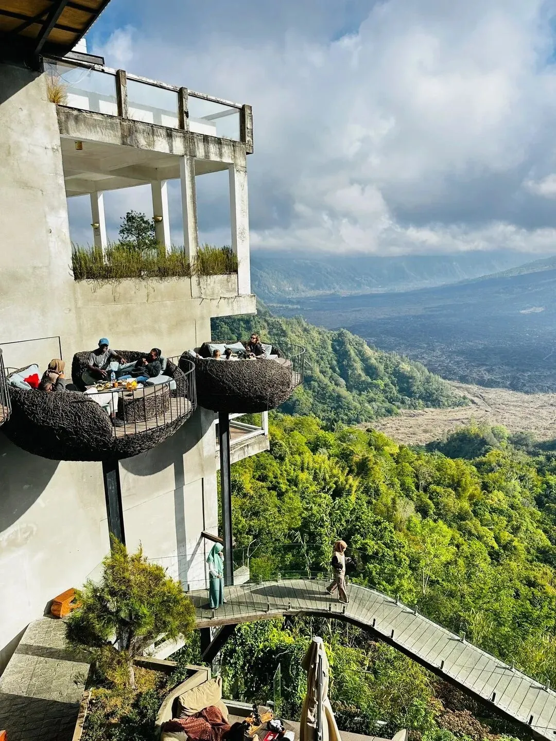 【AKASA 悬崖咖啡厅】火山与咖啡的完美结合,咖啡馆沿山壁而建,共有三层,每一层都能让你感受到大自然的震撼美景,无论你站在哪里,180°的巴图尔火山、巴图尔湖和阿贡火山都尽收眼底,美得让人窒息!