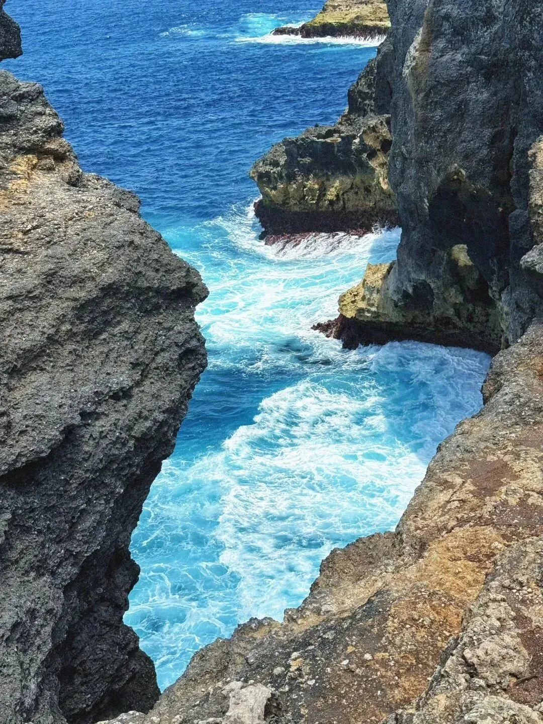 【恶魔之泪】蓝梦岛峡湾因海底地势特殊,海浪冲击山崖就像大海的眼窝涌出泪水一般因此得名“大海的眼泪”,这里有一个巨大的眼泪状回窝,海水拍打过来,不时就会形成十几米高的雾气,很壮观。运气好的话可以看到大浪拍打悬崖产生的七色彩虹。