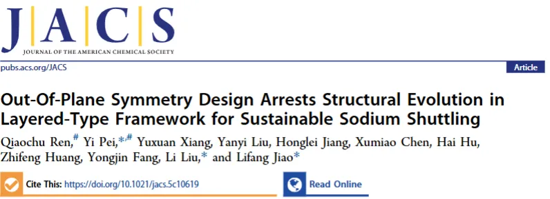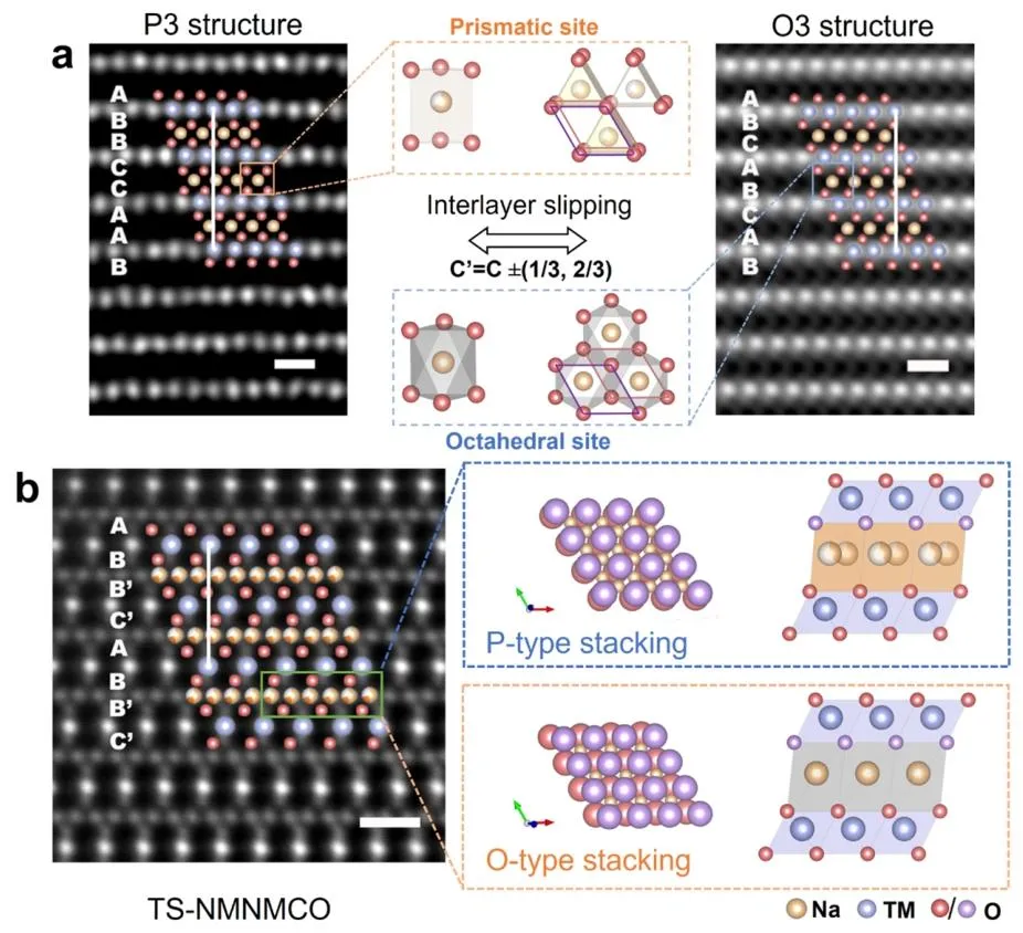 钠离子电池为应对能源转型挑战和锂资源稀缺问题提供了一种引人注目且可持续的解决方案。然而,钠过渡金属氧化物(NaₓTMyO₂)的晶体结构多样性会在脱/嵌钠过程中引发对称性重构,对钠离子电池的稳定运行构成了巨大挑战。近日,南开大学焦丽芳、南京航空航天大学裴一、湘潭大学刘黎等人阐明了面外对称性在抑制NaₓTMyO₂结构演化中关键但此前未被充分探索的作用。通过设计一种单斜畸变,本文建立了一种独特的面外对称性,使得P型和O型间隙位点能够共存于Na离子层,从而有效防止了层间氧离子滑移及随后的对称性演化,即使在深度脱钠状态(每化学式单元剩余Na⁺ < 0.2)下也是如此。这种对称性工程从根本上解决了P3型正极固有的相不稳定性,并消除了由不可逆结构演化引起的累积电压滞后(100次循环内平均滞后电压为0.16 V),实现了高能量密度运行(437.1 Wh kg⁻¹)下的稳定循环。该文章以“Out-Of-Plane Symmetry Design Arrests Structural Evolution in Layered-Type Framework for Sustainable Sodium Shuttling”为题发表在国际著名期刊《Journal of the American Chemical Society》。原文链接:https://doi.org/10.1021/jacs.5c20059图1:P型和O型 NaₓTMyO₂ 正极间相变的示意图。