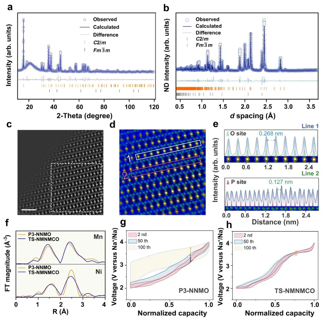 总体而言,当脱/嵌钠过程中的对称性演化对基于 NaₓTMyO₂ 正极的高容量运行构成重大挑战时,本研究揭示了一种通过调控面外对称性来消除对称性演化的关键驱动力——氧层间滑移的新方法。与专注于调节面内对称性以调控电子分布的传统策略不同,本文证明,具有减小重复堆垛单元的单斜畸变面外有序结构,能够使TS-NMNMCO的碱金属层内同时存在P型和O型间隙位点,从而有效防止循环过程中的氧滑移。通过采用原位XRD和非原位中子衍射技术的综合分析,我们观察到一种固溶体反应,即使在完全充电的TS-NMNMCO结构中每化学式单元剩余0.16个Na⁺离子时,也能成功避免触发P→O相演化。因此,与P3型正极中通常观察到的快速容量衰减(100 次循环后剩余 19.7%)和不断升级的电压滞后(100 次循环后平均电压滞后为 0.71V)形成鲜明对比,这种特定的面外对称性使得在整个循环过程中能够实现高能量密度运行(437.1Wh kg⁻¹)且电压滞后很小(平均电压滞后 < 0.2V)。我们的发现强调了面外对称性在基于NaₓTMyO₂的正极对称性演化中的关键作用,而这一因素在钠离子电池的晶体工程学中历来被忽视。展望未来,我们提出,通过战略性地设计电子分布来探索O型或P型框架内面外对称性的多样化表现形式,将能显著增强NaₓTMyO₂在钠离子电池应用中的实际效用。