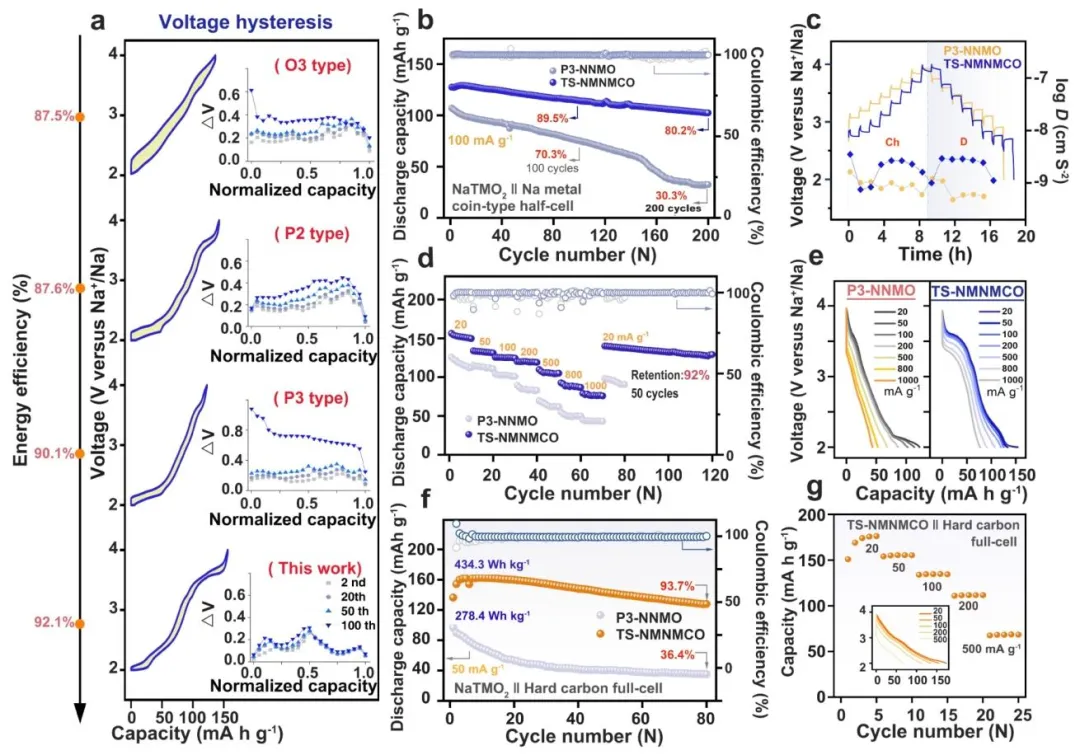 图4:P3-NNMO 和 TS-NMNMCO 在 2.0-4.0 V(vs Na⁺/Na)电压范围内的电化学性能。
