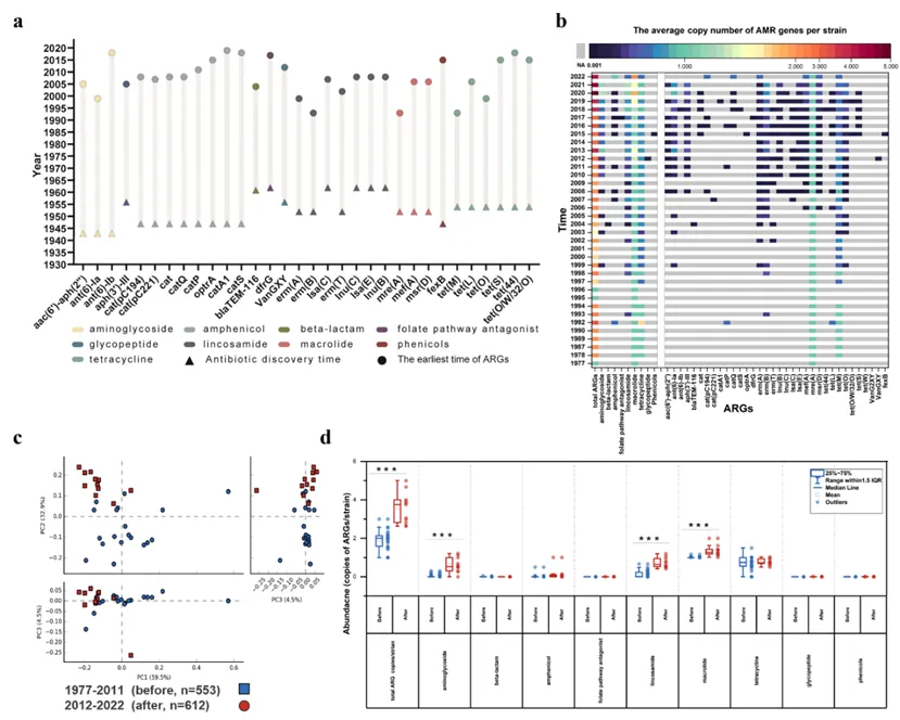 图2. 全球GBS基因组中耐药基因丰度与多态性的时序演变。(a)抗生素发现时间与GBS基因组中耐药基因首次出现时间对比;(b)耐药基因平均拷贝数的时间变化趋势;(c)时间分组前后耐药基因的PCA分析;(d)时间分组前后耐药基因丰度变化(p<0.001)。