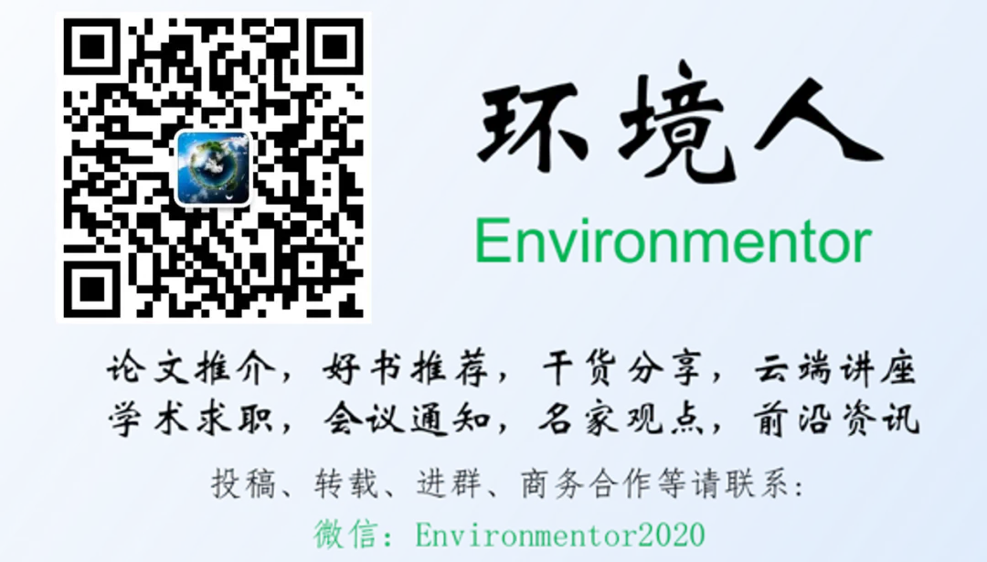 投稿、合作、转载、进群,请添加小编微信Environmentor2020!环境人Environmentor是环境领域最大的学术公号,拥有25W+活跃读者。由于微信修改了推送规则,请大家将环境人Environmentor加为星标,或每次看完后点击页面下端的“在看”,这样可以第一时间收到我们每日的推文!环境人Environmentor现有综合群、期刊投稿群、基金申请群、留学申请群、各研究领域群等共20余个,欢迎大家加小编微信Environmentor2020,我们会尽快拉您进入对应的群。