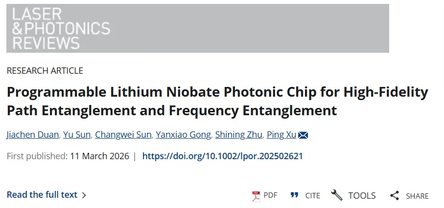 研究成果于2026年3月11日以题为“Programmable Lithium Niobate Photonic Chip for High-Fidelity Path Entanglement and Frequency Entanglement”发表在《Laser & Photonics Reviews》上。