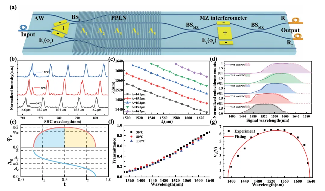 南京大学徐平教授团队提出并实现了一种基于可编程铌酸锂光子芯片的多功能量子光源方案。他们设计并制备了由串联多极化结构、马赫-曾德尔干涉仪和电光调制器组成的铌酸锂量子光子芯片,通过对这些组件进行编程调控,成功产生了波长可调的高保真反聚束光子对、路径纠缠光子对和频率纠缠光子对。实验测得反聚束光子对的片外Hong-Ou-Mandel干涉可见度超过99%,频率纠缠和路径纠缠的保真度均高于0.99,且所有量子态均保持了较高的芯片耦合效率。该工作为发展可编程多功能量子光源及光纤量子传感与量子通信网络奠定了重要基础。