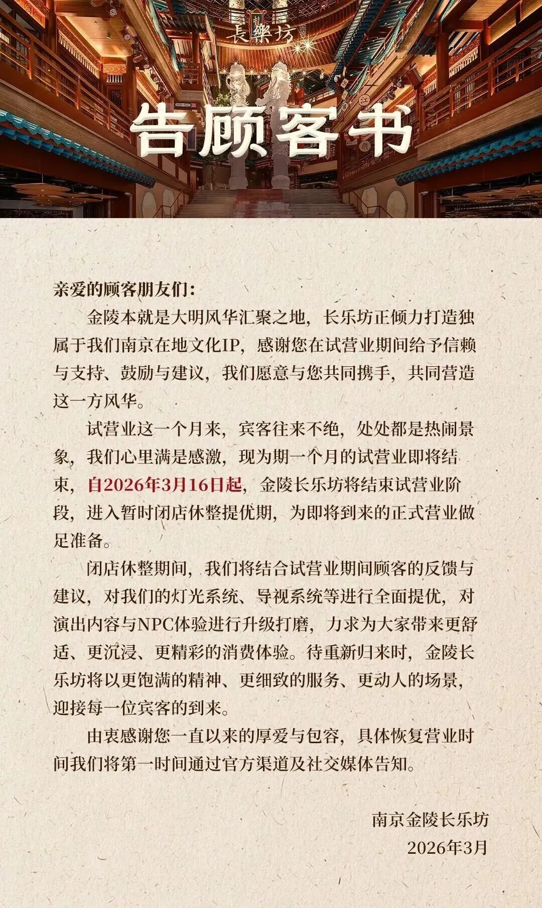 3月15日,金陵长乐坊发布告顾客书,公告显示,自2026年3月16日起,金陵长乐坊将正式结束试营业阶段,进入闭店休整提优期。