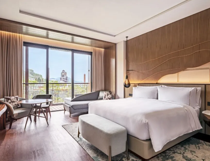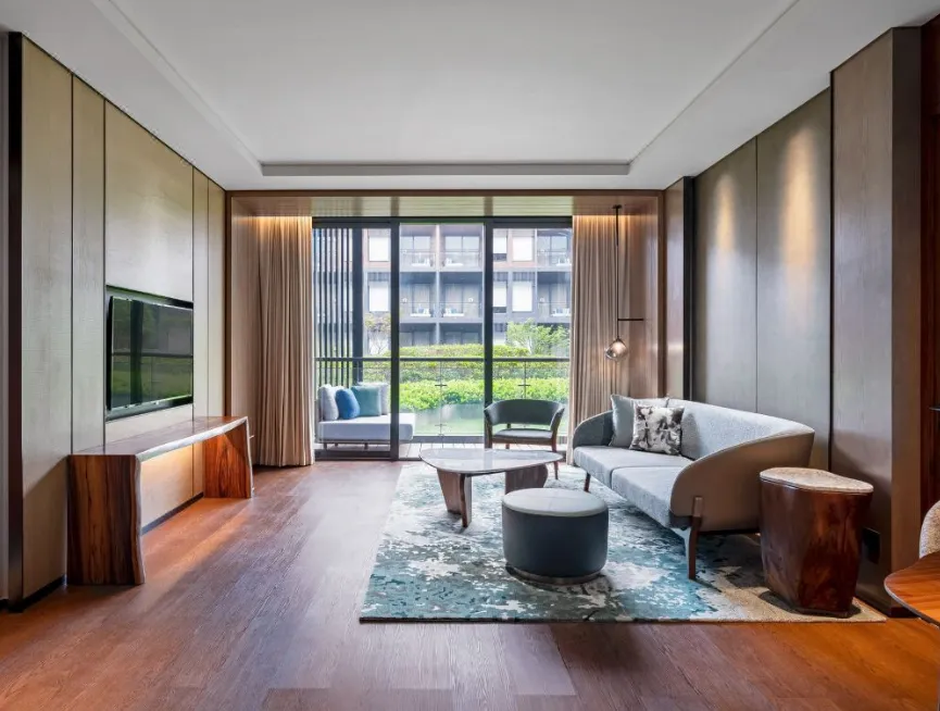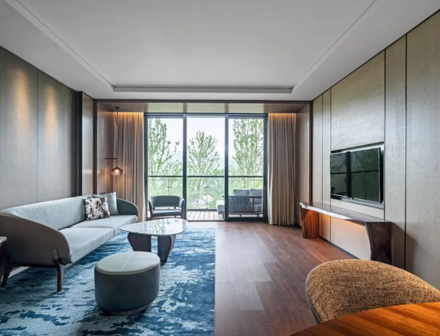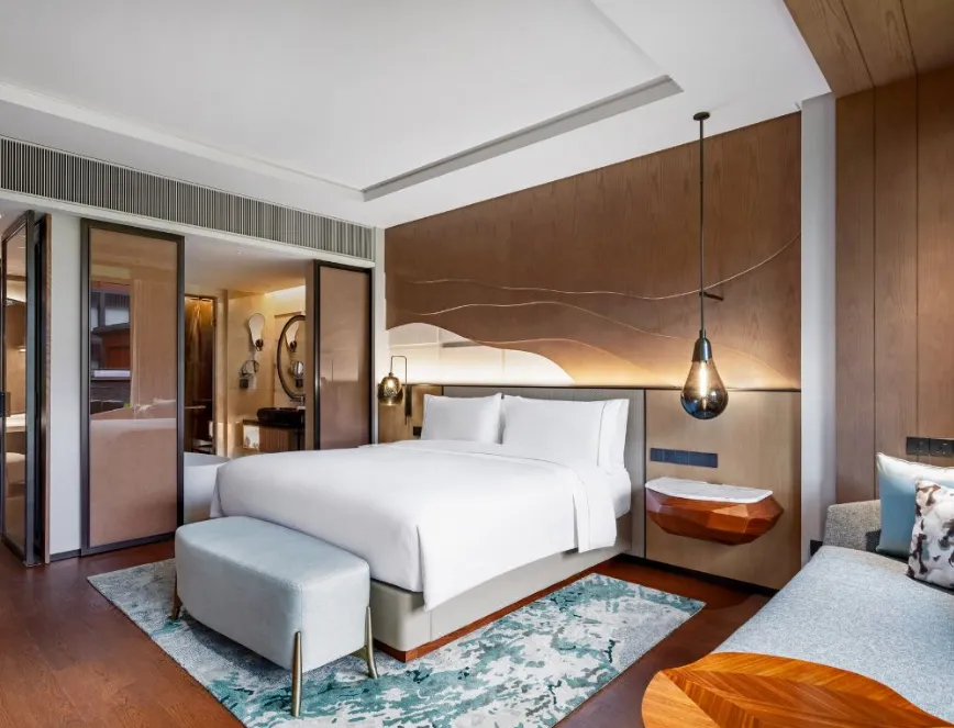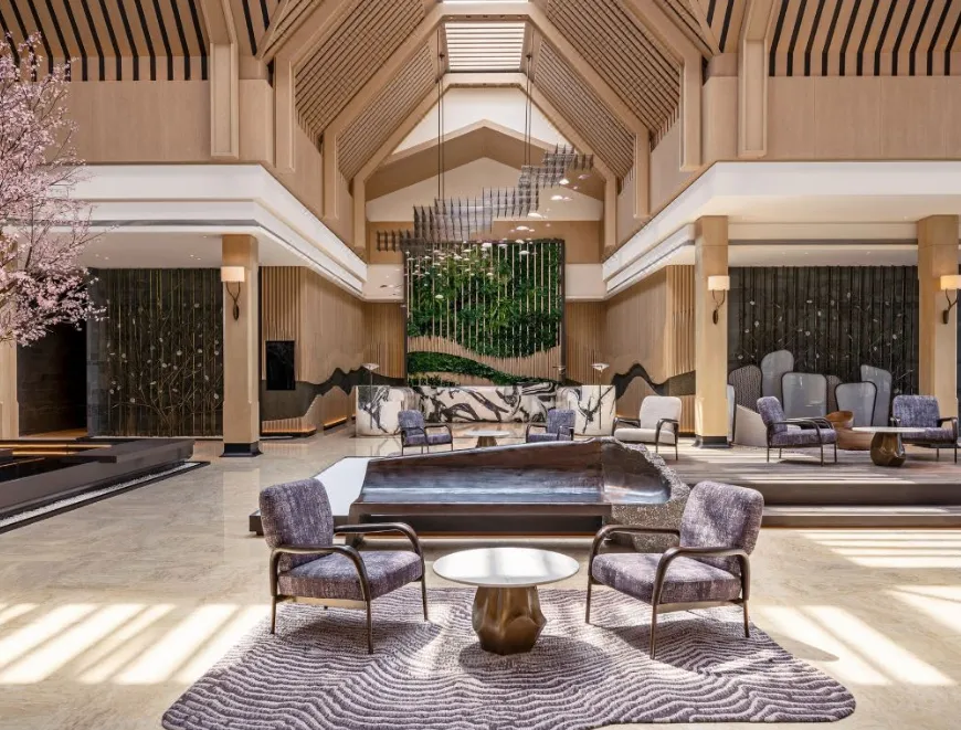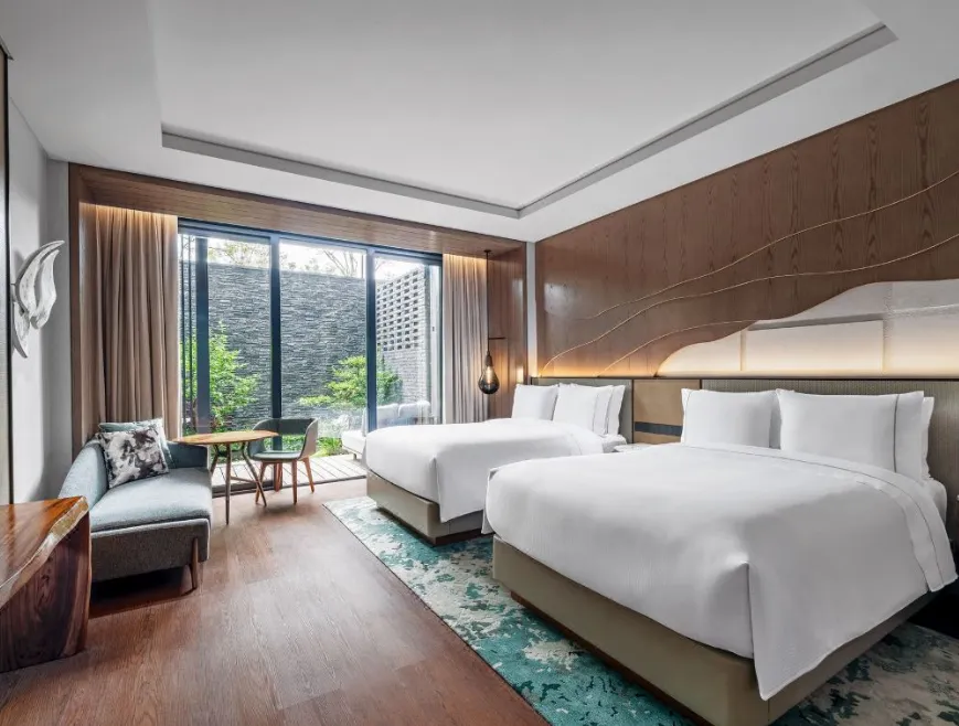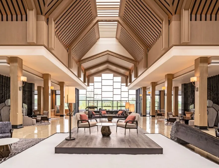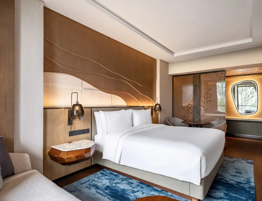 南京威斯汀温泉度假酒店位于江苏园艺博览会的江苏省园艺博览园内,酒店汲取江南建筑的粉墙黛瓦元素,形成了传承金陵底蕴的新中式建筑风格,与周边的自然环境巧妙呼应。客房采用天然材料和唤起自然意象的元素,营造无与伦比的感官体验,提升了整个酒店源于自然的美感。