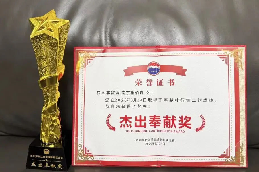 星光不负赶路人,江河眷顾奋楫者。在3月14日贵州茅台江苏省经销商联谊会一季度会议年度评优工作中,南京裕佰鑫百货贸易有限公司传来捷报:茅台文化品饮师李留留凭借其在2025年度的卓越表现与无私奉献,荣获“杰出奉献奖”!这一荣誉不仅是对李留留个人专业素养与敬业精神的高度肯定,更是贵州茅台江苏省经销商联谊会对南京裕佰鑫在茅台文化弘扬与队伍建设方面所取得成果的充分认可。
