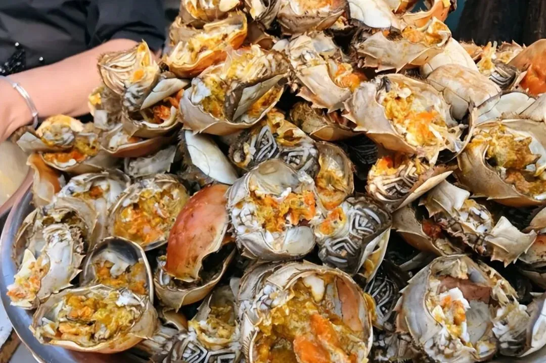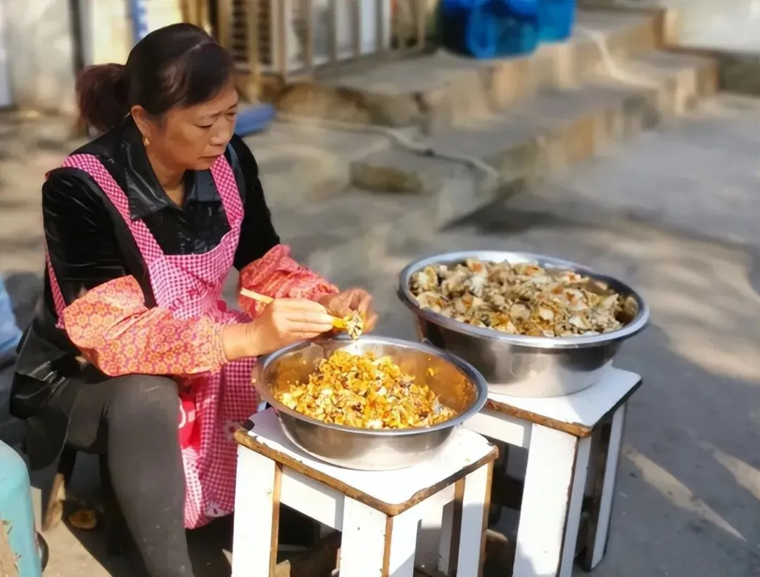 山东女子慕名而来,刚刚走到店门口,就看见一个阿姨正在从大闸蟹中取蟹黄,取出来的蟹黄放在一个大盆子里,挑剩下的蟹壳,像小山一样堆在一旁。