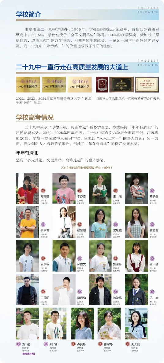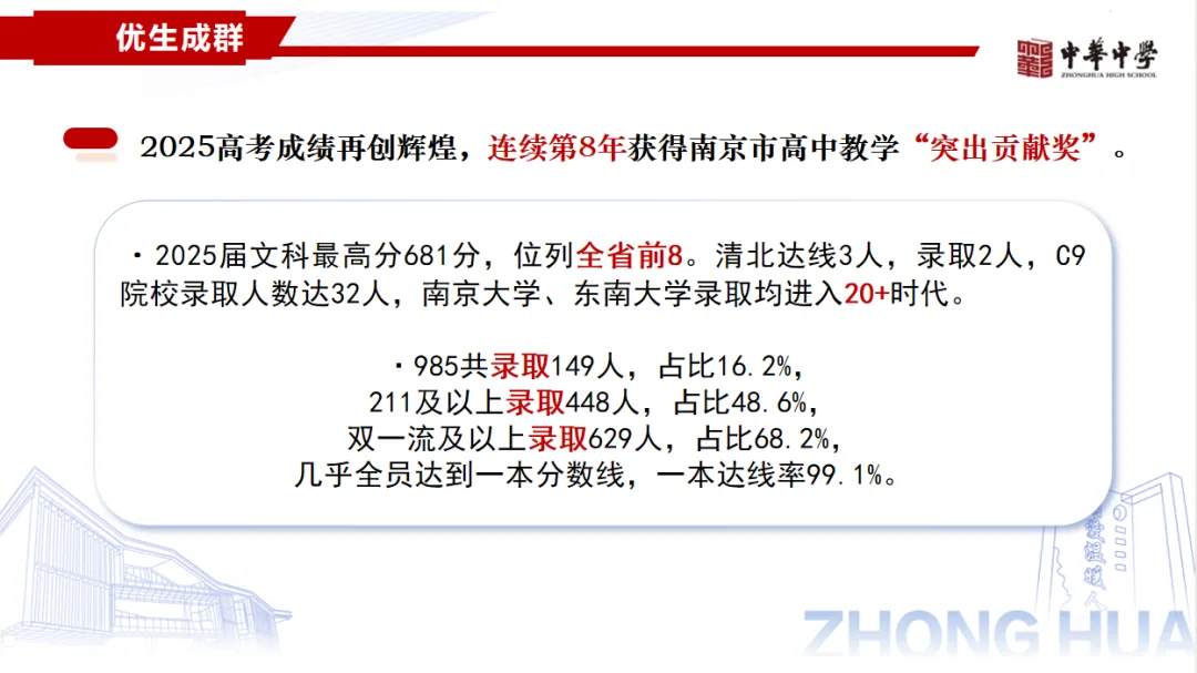 2025届文科最高分681分,位列全省前8。清北达线3人,录取2人,C9院校录取人数达32人,南京大学、东南大学录取均进入20+时代。
