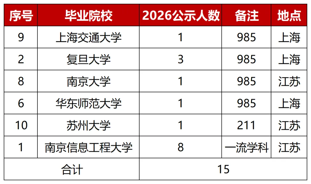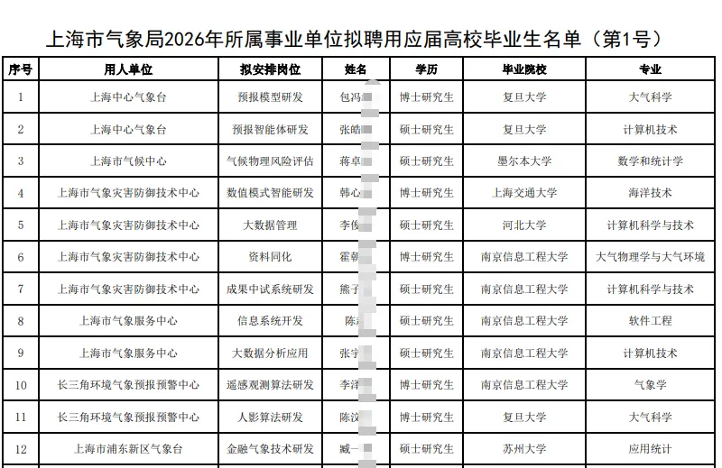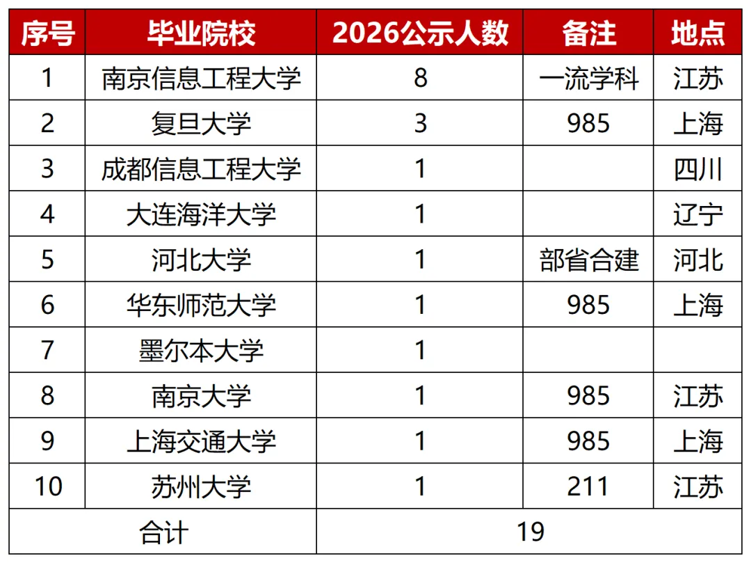 录用人数略多的高校:南京信息工程大学、 复旦大学,生源高校有10所。 名单如下: