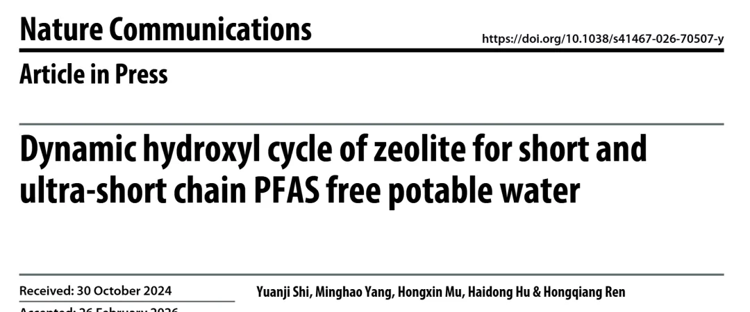 近日,南京大学污染控制与资源化研究国家重点实验室、环境学院的研究团队在《Nature Communications》发表重要研究成果,提出一种基于沸石的动态羟基循环新策略,仅以水为介质实现商用沸石的吸附 - 再生循环,可高效、可持续去除饮用水中的短链及超短链全氟 / 多氟烷基物质(PFAS),为解决全球 PFAS 污染危机提供了低成本、易推广的饮用水净化方案,相关研究成果 doi:10.1038/s41467-026-70507-y。