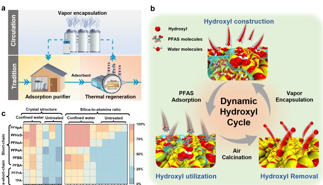 针对这一痛点,研究团队摒弃传统的官能团固定化改性思路,开发了非固定化动态羟基循环技术。该技术通过水蒸气扩散法,在商用沸石纳米孔道中构建 “沸石骨架限域水” 结构,仅以水为试剂驱动 Si-OH 和限域水 - 羟基网络的动态循环,无需额外添加化学试剂。实验证实,该策略让沸石形成了独特的 “沸石骨架 - 限域水” 双结合模式,既通过范德华力结合 PFAS 的 C-F 疏水链,又以限域水的氢键作用结合其亲水端,同时降低了纳孔扩散的脱水能垒,大幅提升了纳孔可及性。