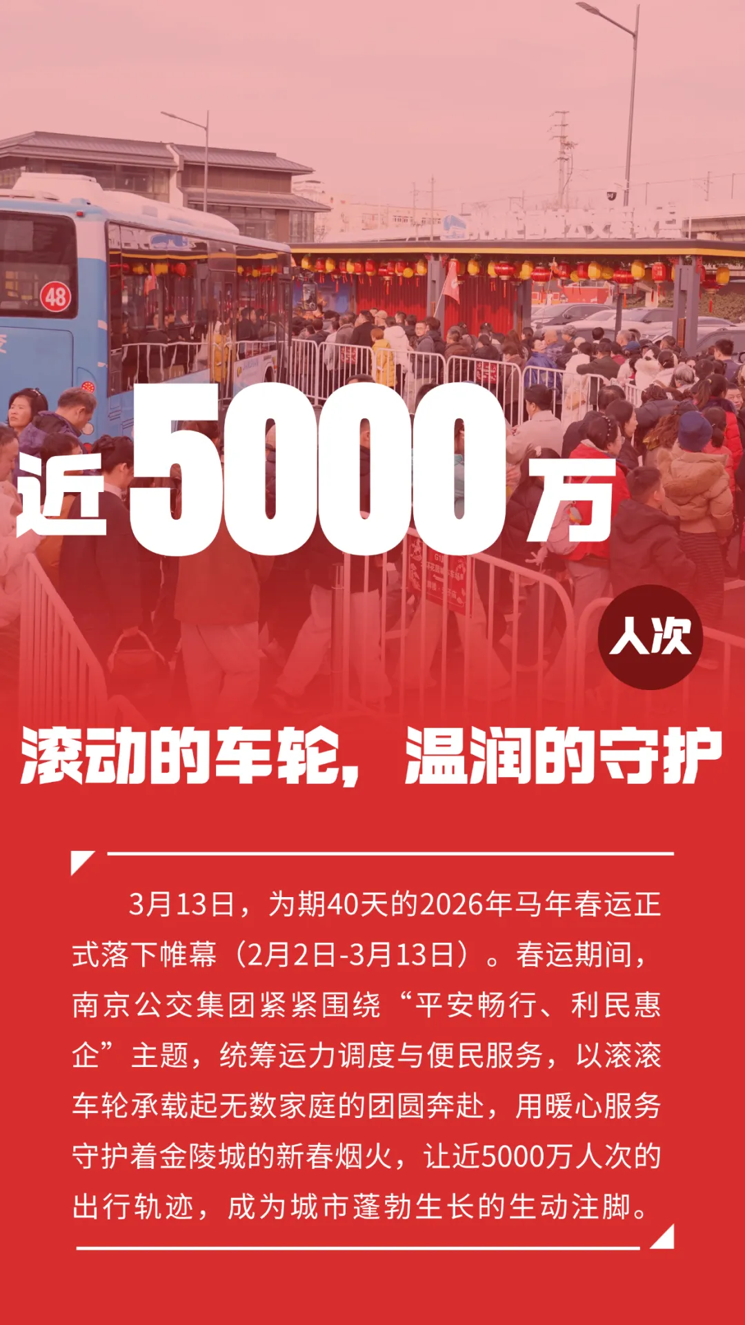 春运期间,南京公交通过“免费乘坐+文化植入+科技赋能”的组合拳,有效分流景区周边交通压力,显著提升公共资源利用率。南京“公交+文旅”获央视《新闻直播间》、江苏新闻等媒体报道500余次;搀迎帮扶、拾金不昧等好人好事获央广网、江苏电视台、南京日报等媒体报道600余次。