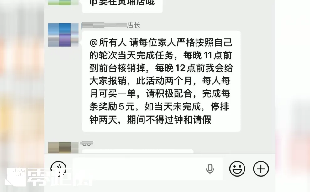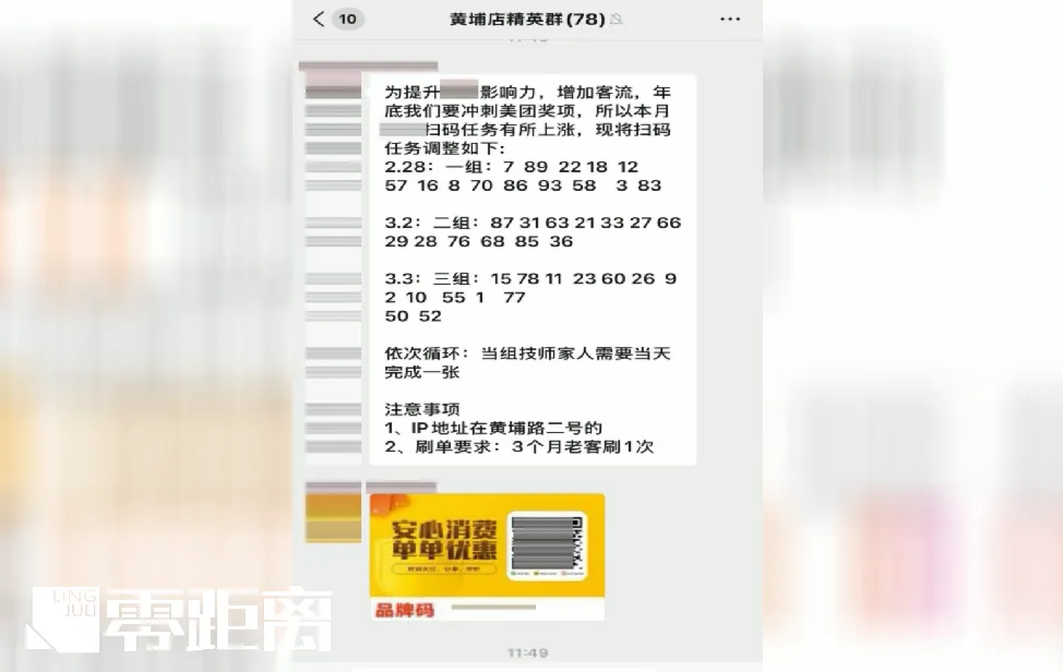 在进一步的交谈中,零距离记者了解到,刷单行为在该门店已经持续了半年以上,并且形成了一套完整的“任务链”。该店有40多名技师,被店长分成了三个组。每天由一个组负责刷单,每人至少刷一单,而管理人员每人每天要刷4个空单。店长助理每天会在工作群内催促刷单,确保完成任务。