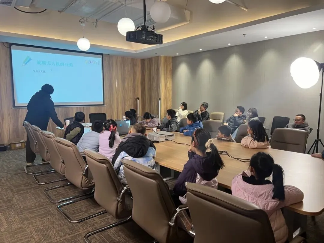 小朋友们和家长陆续到场,在签到台认真写下自己的名字,不少孩子刚进门就被展台上各式各样的无人机吸引,围着展台叽叽喳喳讨论,凑在一起观察机身结构。工作人员贴心引导大家有序落座,温馨的亲子氛围、浓厚的探索气息,瞬间拉满活动仪式感。