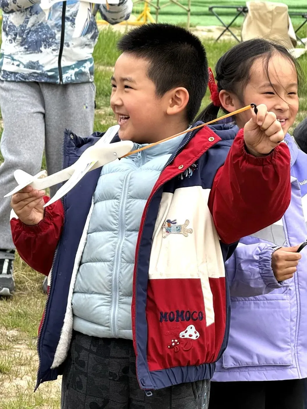 带着精心制作的纸飞机,孩子们来到我们俱乐部的户外飞场,迎来最期待的试飞环节!大家像打弹弓一样,奋力将纸飞机抛向空中欢呼声、笑声回荡在场地中,每一张小脸上都写满了兴奋与喜悦。