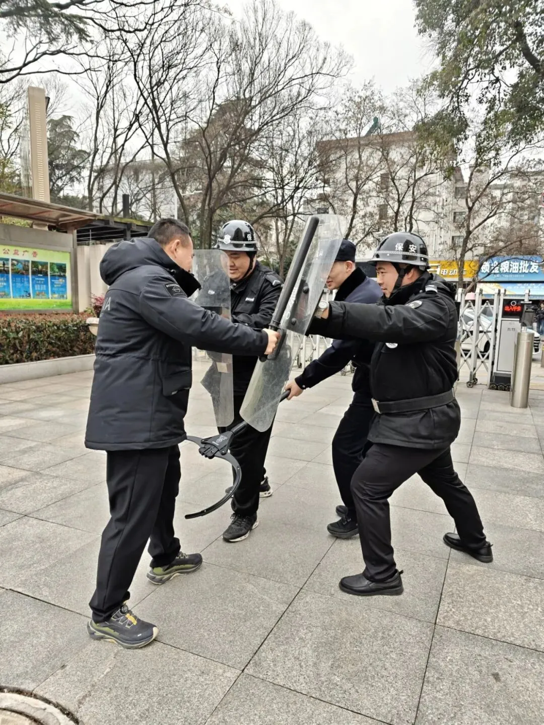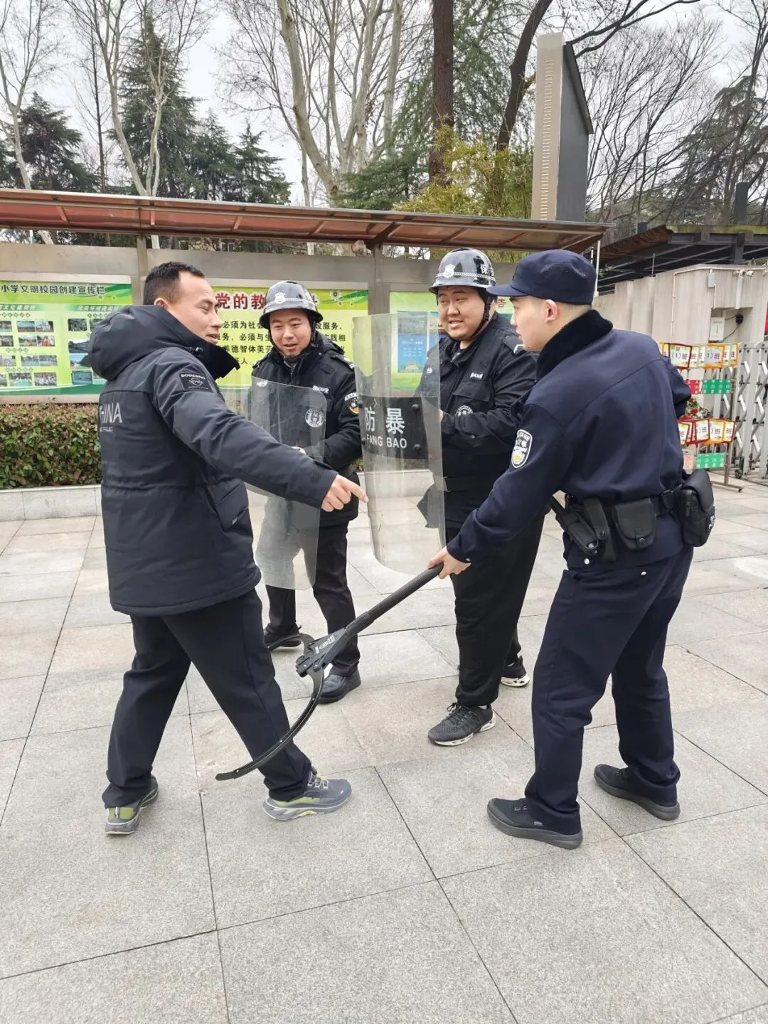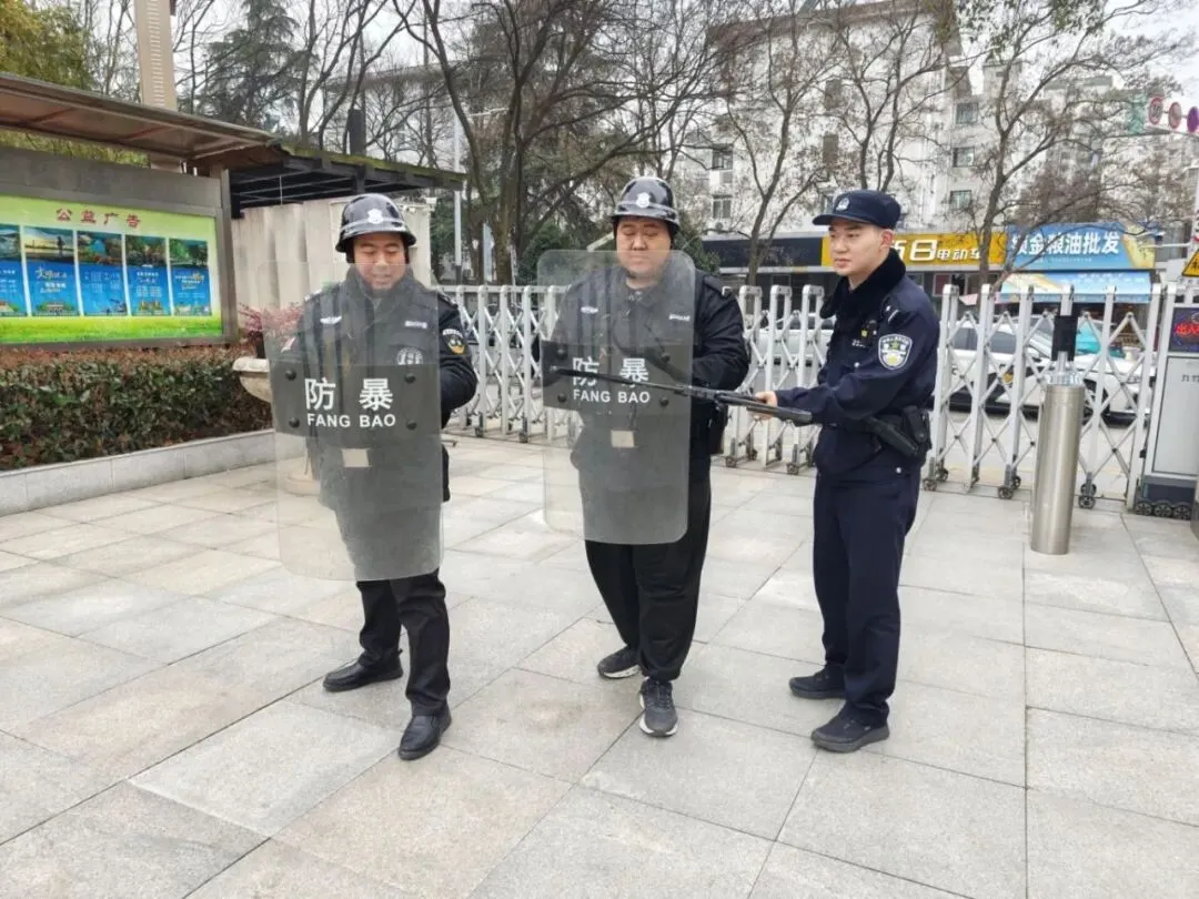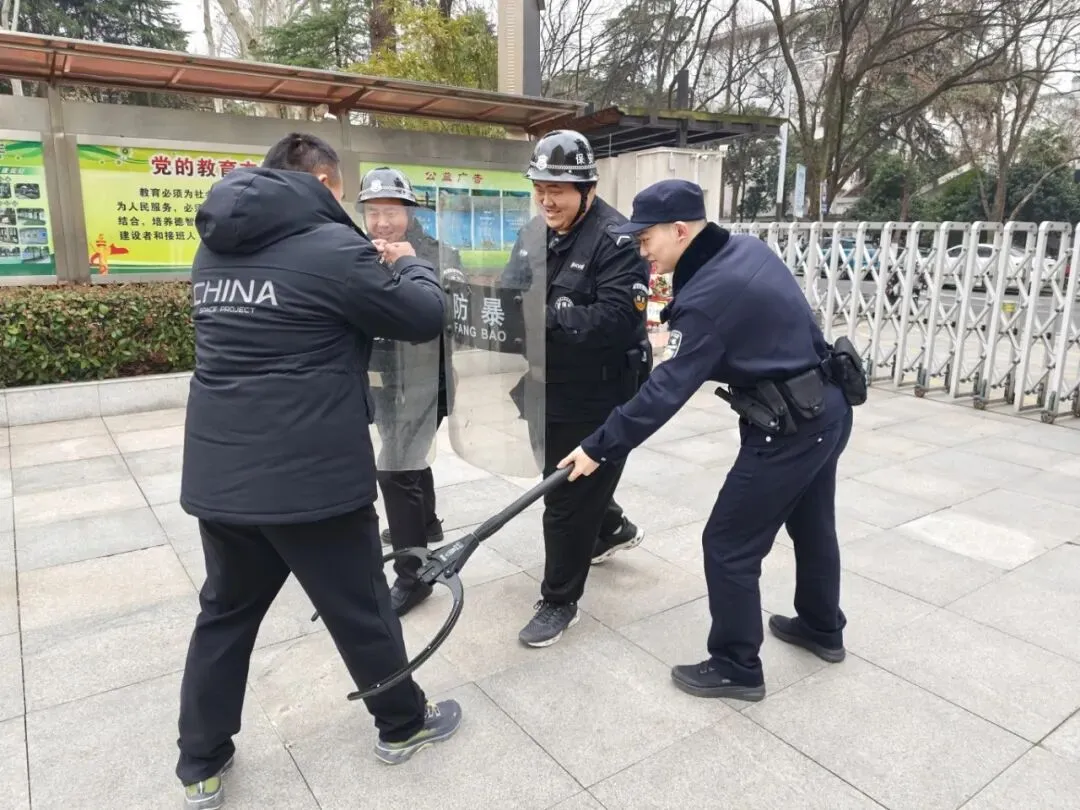 学校还联合派出所,邀请了学校的法制副校长戴宇康警官到校与保安进行最小作战单元的演练。演练过程中,模拟了多种突发安全事件场景,如外来人员强行闯入校园、校园内发生暴力冲突等。在戴警官的专业指导下,校园保安迅速反应,按照既定的应急预案,熟练运用防暴器械,与“不法分子”进行周旋,成功将其控制。