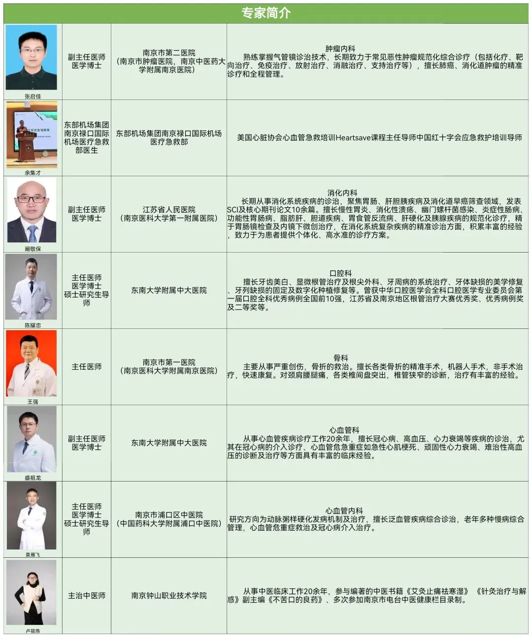 本次义诊专家团由皖南医科大学南京校友会组织,成员均来自南京各大三甲医院,涵盖以下多个重点专科:心血管内科(冠心病介入)、神经内科(脑血管介入)、眼科、消化内科、骨科、口腔科、妇科、产科、内分泌科、呼吸内科、消化肿瘤外科、肿瘤内科、急诊医学、麻醉科(疼痛科)、中医养生针灸科、老年医学科等。