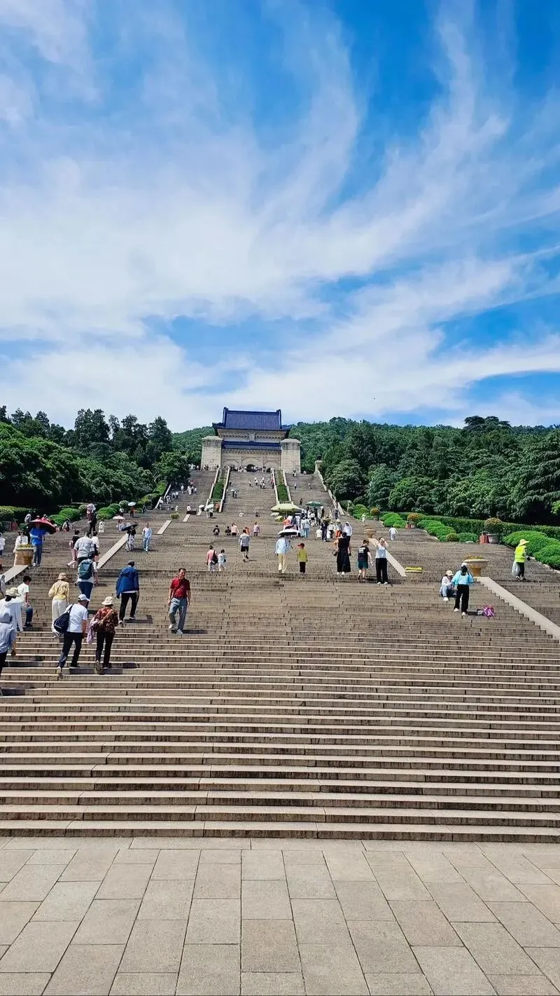 第二天去中山陵。爬台阶爬到一半,腿有点酸,坐在路边石阶上歇脚。旁边一对本地老夫妻也在休息,老太太看我一个人,递过来一瓶水:”年轻人,喝口水,392级台阶嘞,慢慢走不急。”