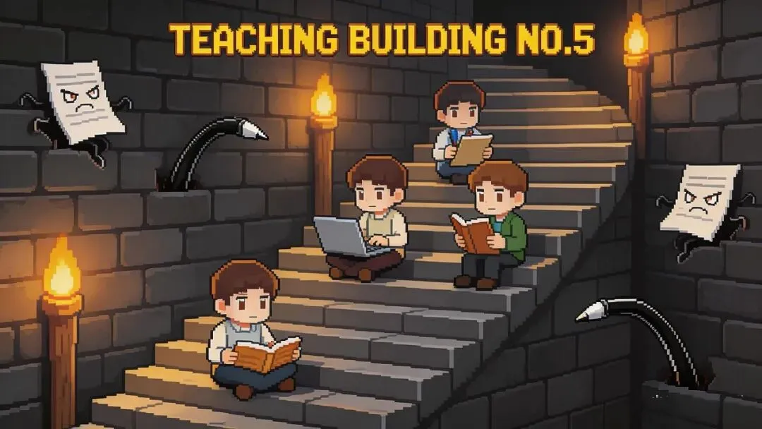 南林日常:一头扎进教五楼自习室,楼层越高,距离期末考试越近,脑子里的“怪物”(难点)也越强。每解开一道难题,就像敲碎一块岩石,运气好的话能爆出一个“解题思路”(星之果实)。