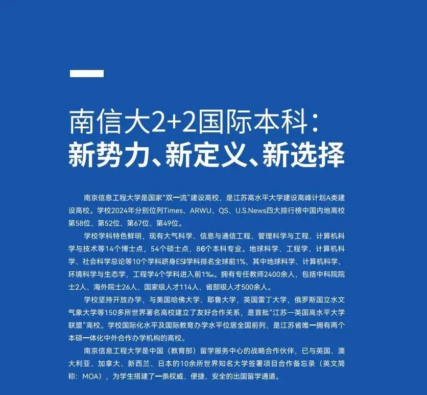 2+2国际本科是南京信息工程大学和教育部(中国)留学服务中心正式签署的战略合作伙伴关系项目,是目前国内(计划外)出国留学主流项目。该项目学制设置科学合理,克服了直接出国留学的诸多弊端。