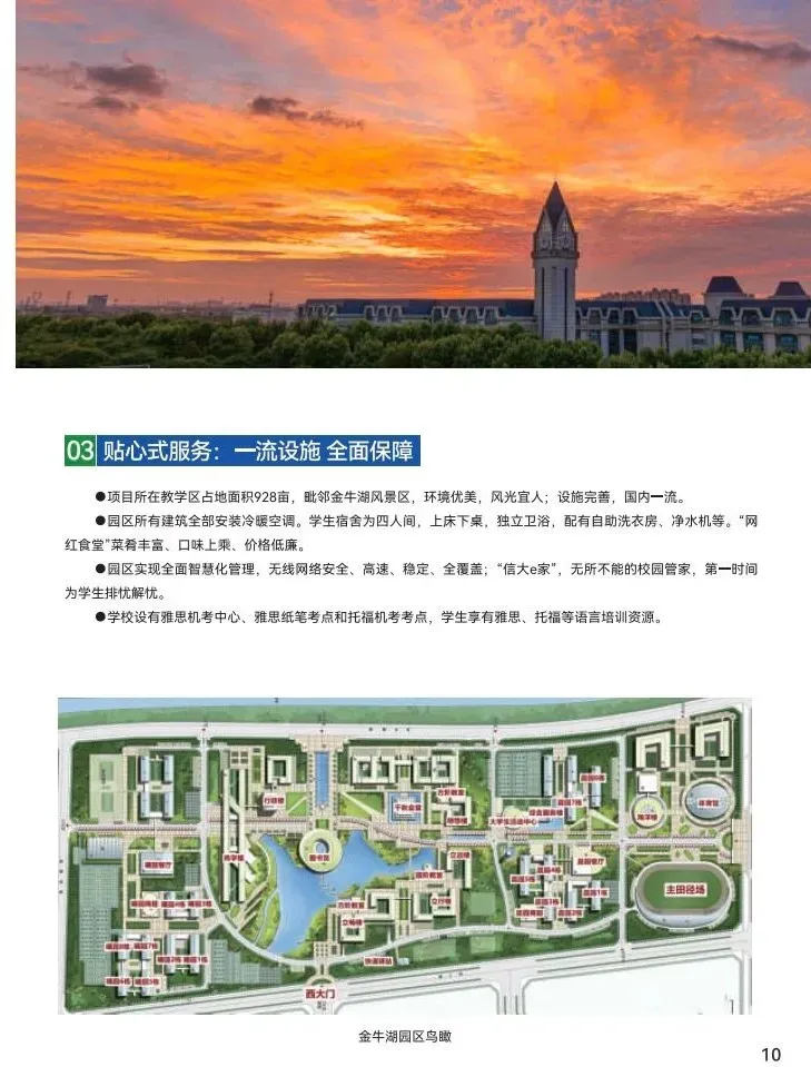 ● 项目所在教学区占地面积928亩,毗邻金牛湖风景区,环境优美,风光宜人;设施完善,国内一流。
