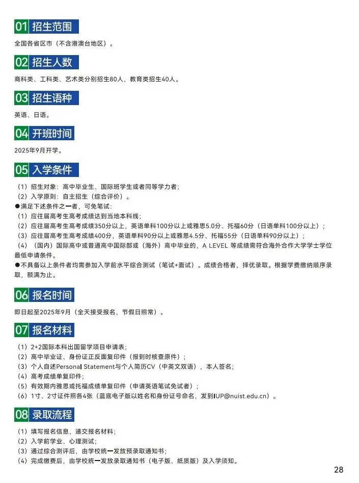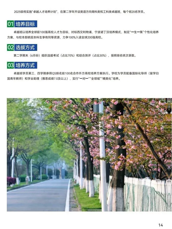 ● 2024级启动“精英培养计划”,在第二学年开设财经类“雷丁班”、工科类“南沃班”,每个班20名学员。精英班以培养全球前100强高校人才为目标,由雷丁学院、沃特福德学院代为培养。