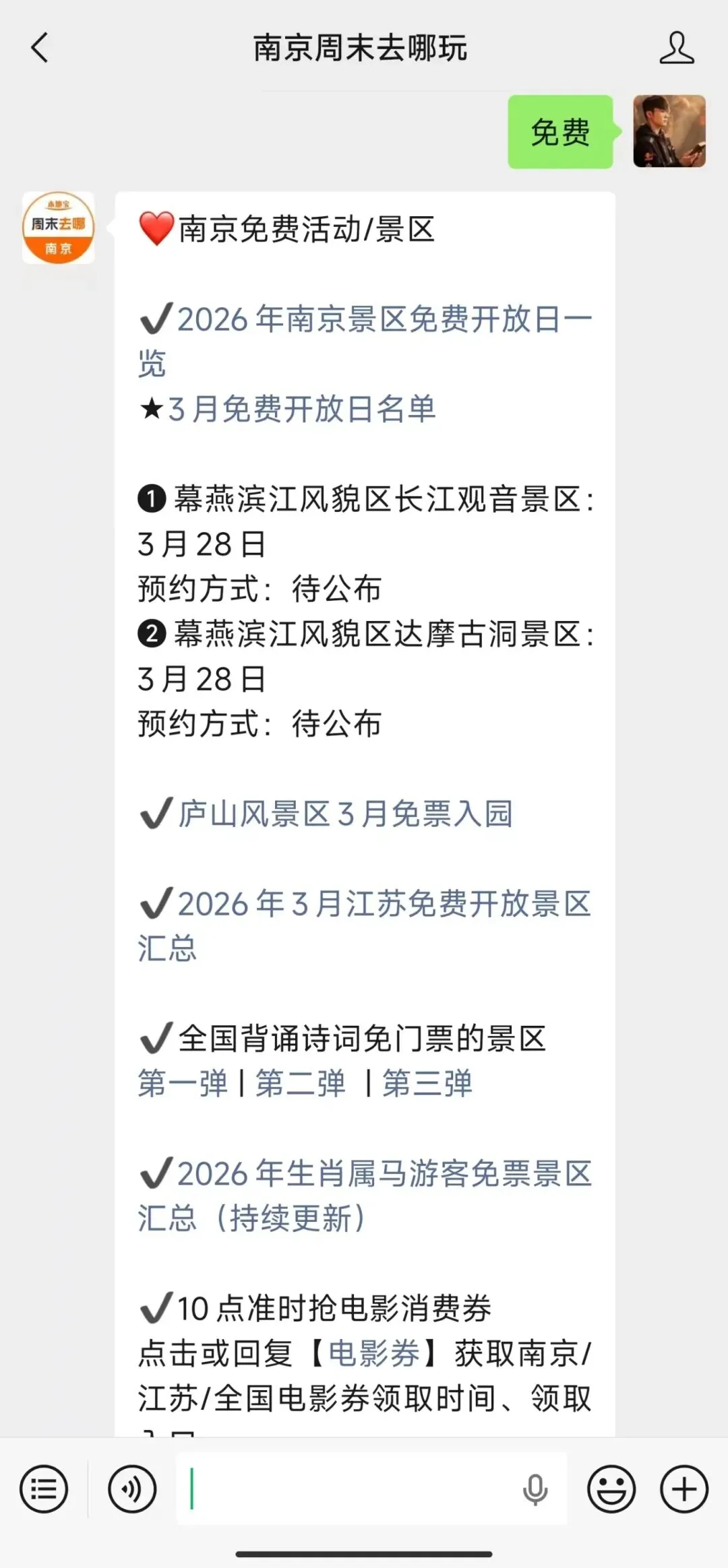 回复【免费】获取南京免费信息汇总